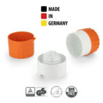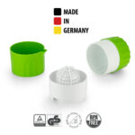 Oryginalna ręczna wytłaczarka do soków “Pan Soczek” firmy BORNER z koroną – dla świeżych, bogatych w witaminy soków z warzyw i owoców. Za pomocą uchwytu, tzw. korony, wyciśniesz z owocu lub warzywa cały sok – co do kropli, a cały sok spłynie do pojemnika poniżej.