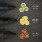 Wkładka 3,5 mm oraz 7 mm dają dodatkowo po 2 grubości kostki lub pasków. Dlatego dzięki wymiennym wkładkom i regulacji grubości uzyskamy w sumie aż 10 możliwości krojenia warzyw i owoców. Wystarczy więc przesunąć wkładkę na odpowiednie położenie.