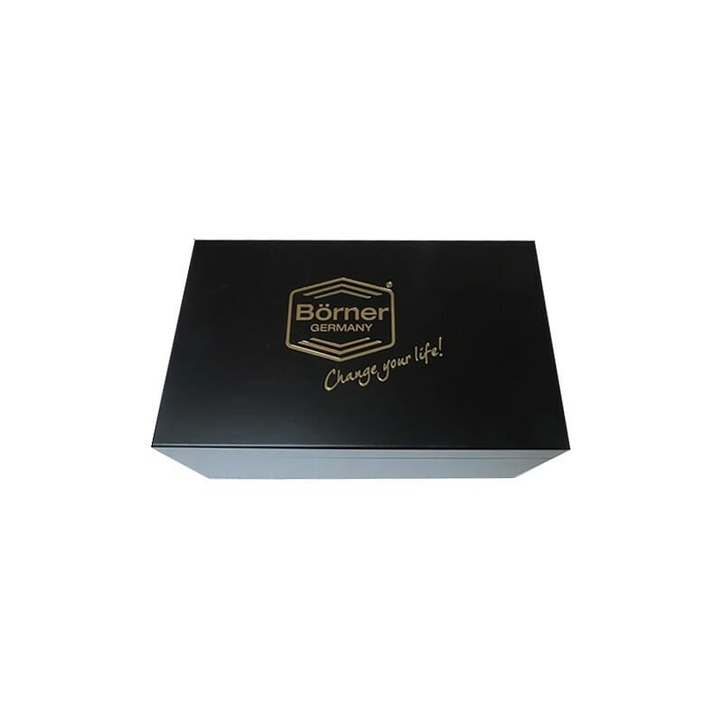 - Cały komplet idealnie nadaje się na prezent, zapakowany w eleganckie, czarne pudełko z drewna olchowego, wyścielone aksamitem ze złotym logo Borner.