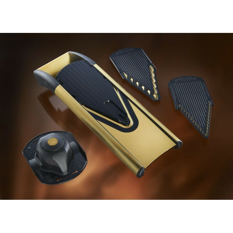 Jeden z nowszych produktów firmy Borner. Szatkownica Exclusive Line V6 GoldLine Borner do warzyw i owoców (z 4 wkładkami, w tym dwie wkładki z nożami 3,5mm i 7 mm) z uchwytem zabezpieczającym dłonie, w kolorze czarnym pokryta 24 karatowym złotym. Do całości dołączone jest ekskluzywne opakowanie, czarna skrzynka z drewna olchowego wyścielona aksamitem, na skrzynce widnieje złote Logo- Borner. Szatkownica V6 Gold Line swoim 24 – karatowym ozłoceniem ujmuje elegancją w wyglądzie i wykonaniu oraz spełnia najwyższe standardy trwałości i estetyki. Jednocześnie jest ona poprzez sprawdzoną jakość noży i wypracowaną technologię Börner Germany niezbędną pomocą do krojenia warzyw i owoców o trzech różnych grubościach plastra i 4 różnych rozmiarach pasków, słupków. W zestawie znajduje się uchwyt zabezpieczający dłonie w czasie pracy, który umożliwia starcie warzyw i owoców w całości. Jednocześnie chroni palce przed zranieniem. Mandolina kuchenna to idealny produkt do krojenia zarówno warzyw jak i owoców.