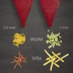 Dzięki wymiennym wkładkom i regulacji grubości uzyskamy w sumie aż 10 możliwości krojenia warzyw i owoców. Dlatego wystarczy przesunąć wkładkę na odpowiednie położenie.