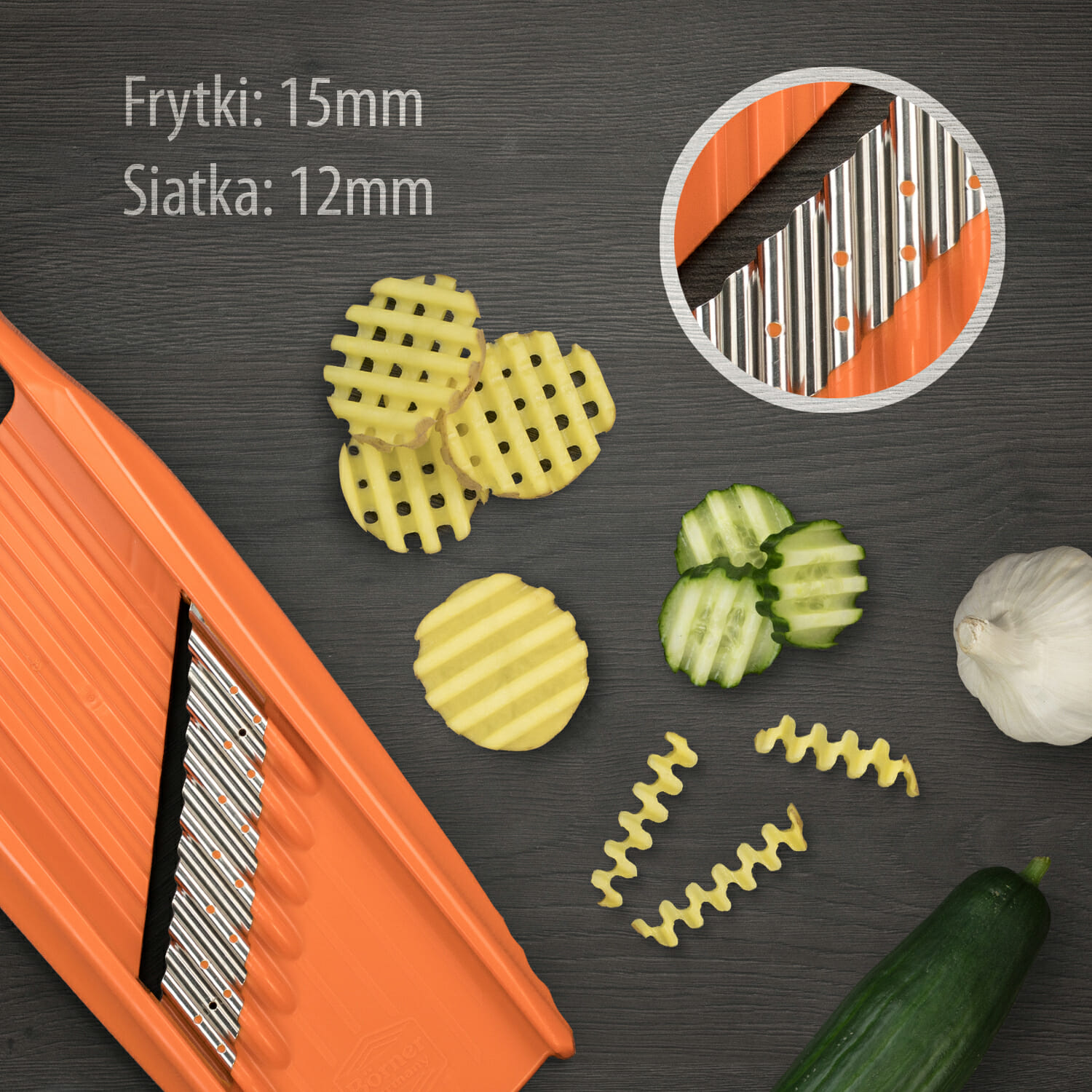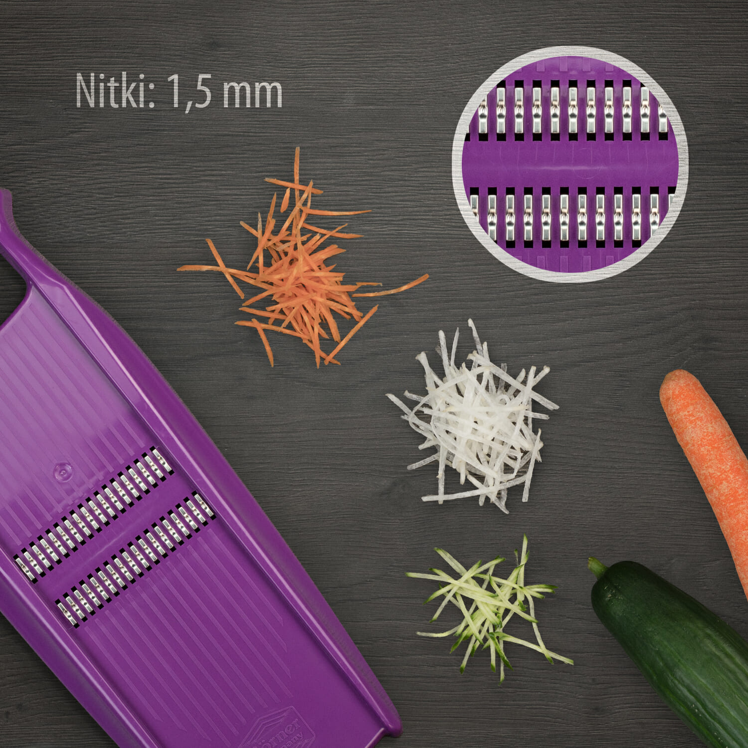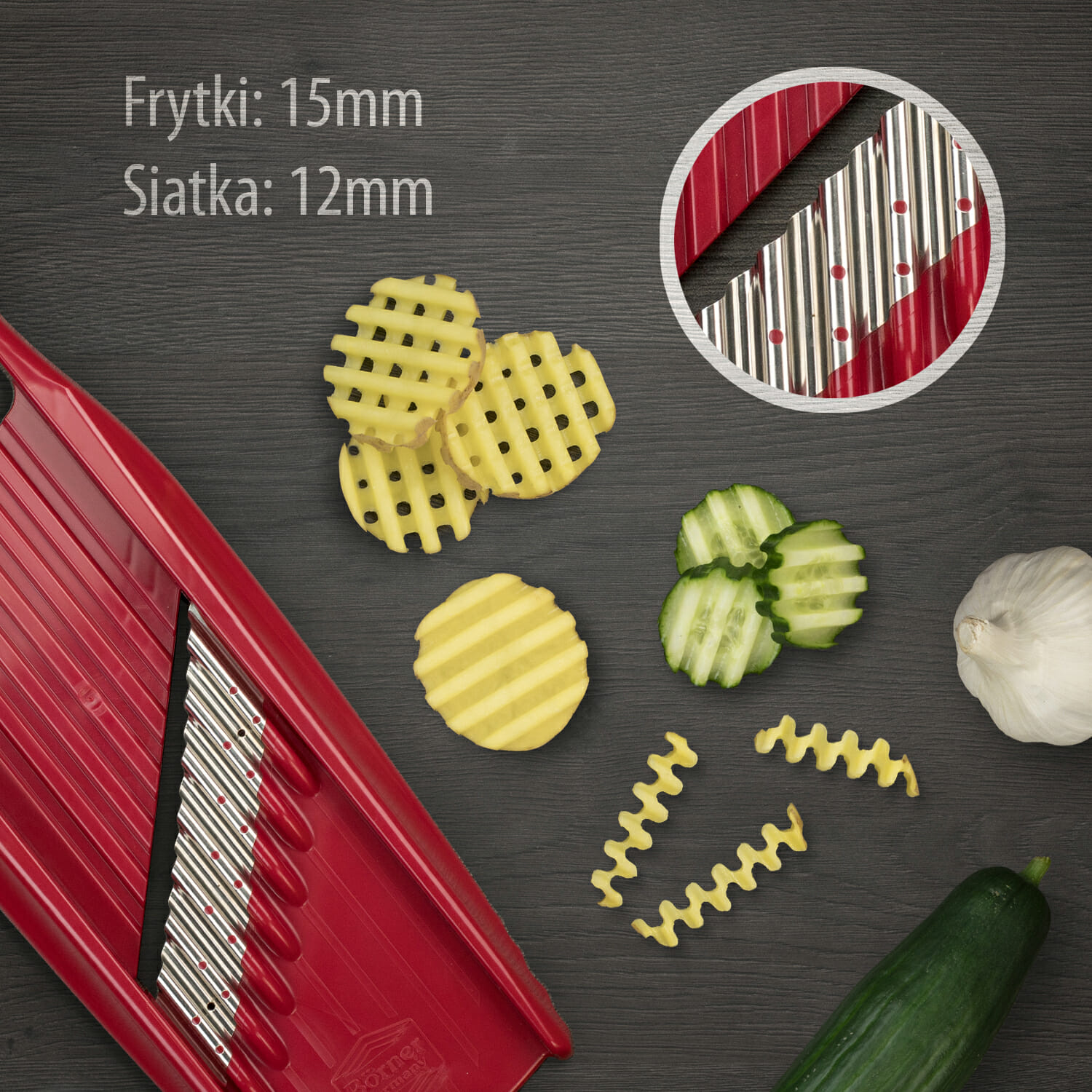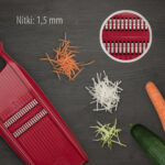 Tarka do warzyw ROKO PowerLine – warzywa krojone na tych nożach dają znakomity efekt włosów krótkich i długich. Ułożenie warzywa krótką powierzchnią daje nam krótkie wiórki, natomiast ułożenie dłuższą powierzchnią daje nam włosy długie nawet do 10 cm.