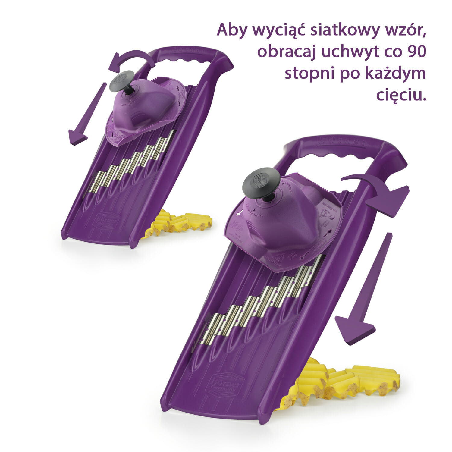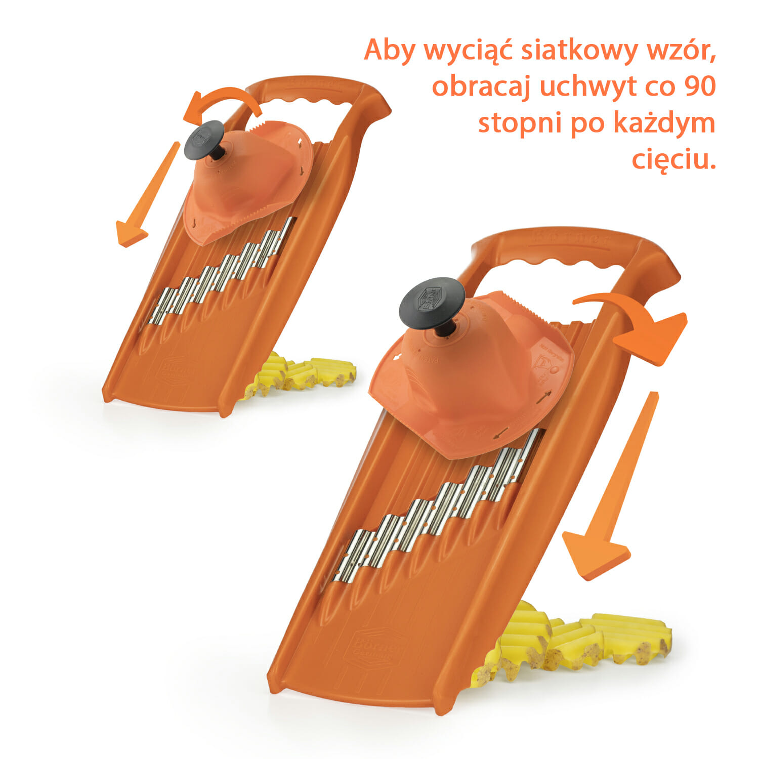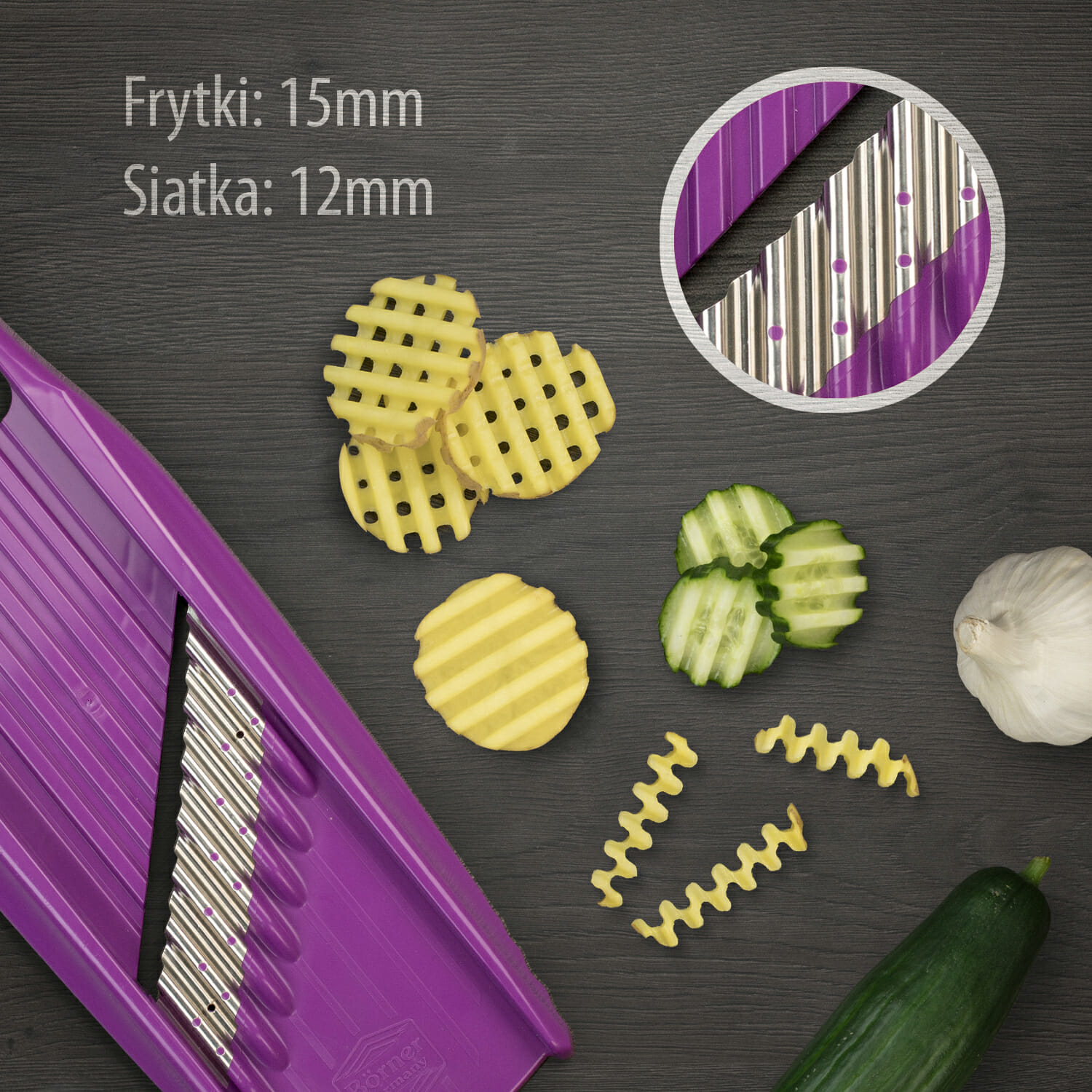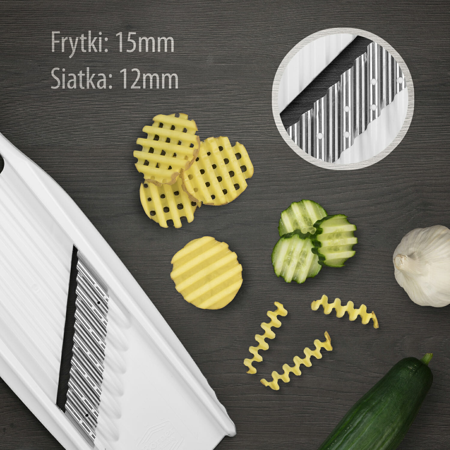 Tarka do warzyw ROKO PowerLine – warzywa krojone na tych nożach dają znakomity efekt włosów krótkich i długich. Ułożenie warzywa krótką powierzchnią daje nam krótkie wiórki, natomiast ułożenie dłuższą powierzchnią daje nam włosy długie nawet do 10 cm.