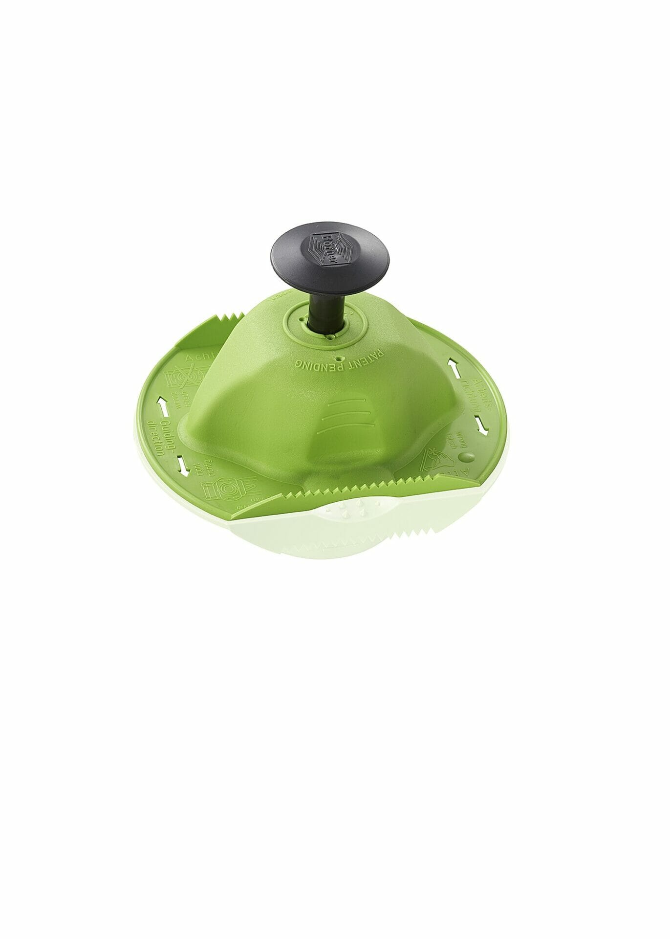 Uwaga : w czasie pracy, gdy warzywo lub owoc wystaje jeszcze z uchwytu prowadzimy uchwyt “góra dół” nie przyciskając wystającego na uchwycie przycisku. Natomiast gdy warzywo lub owoc nie wystaje już z uchwytu, dopiero wówczas stopniowo dociskamy przycisk -> wypychając pozostałą część warzywa.